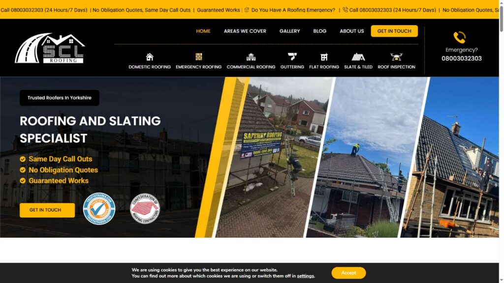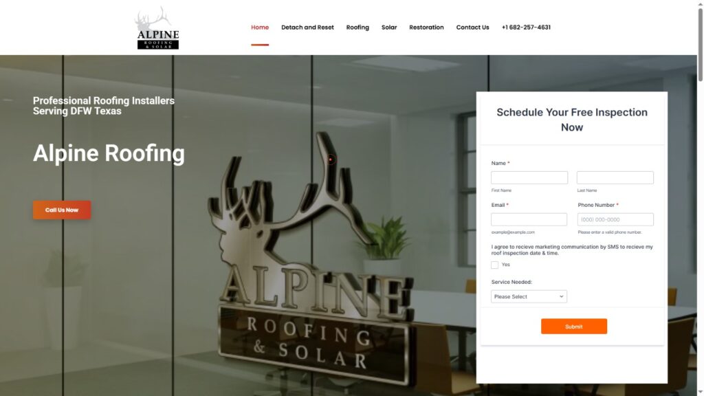 Roofing services website with quote calculator and project gallery.